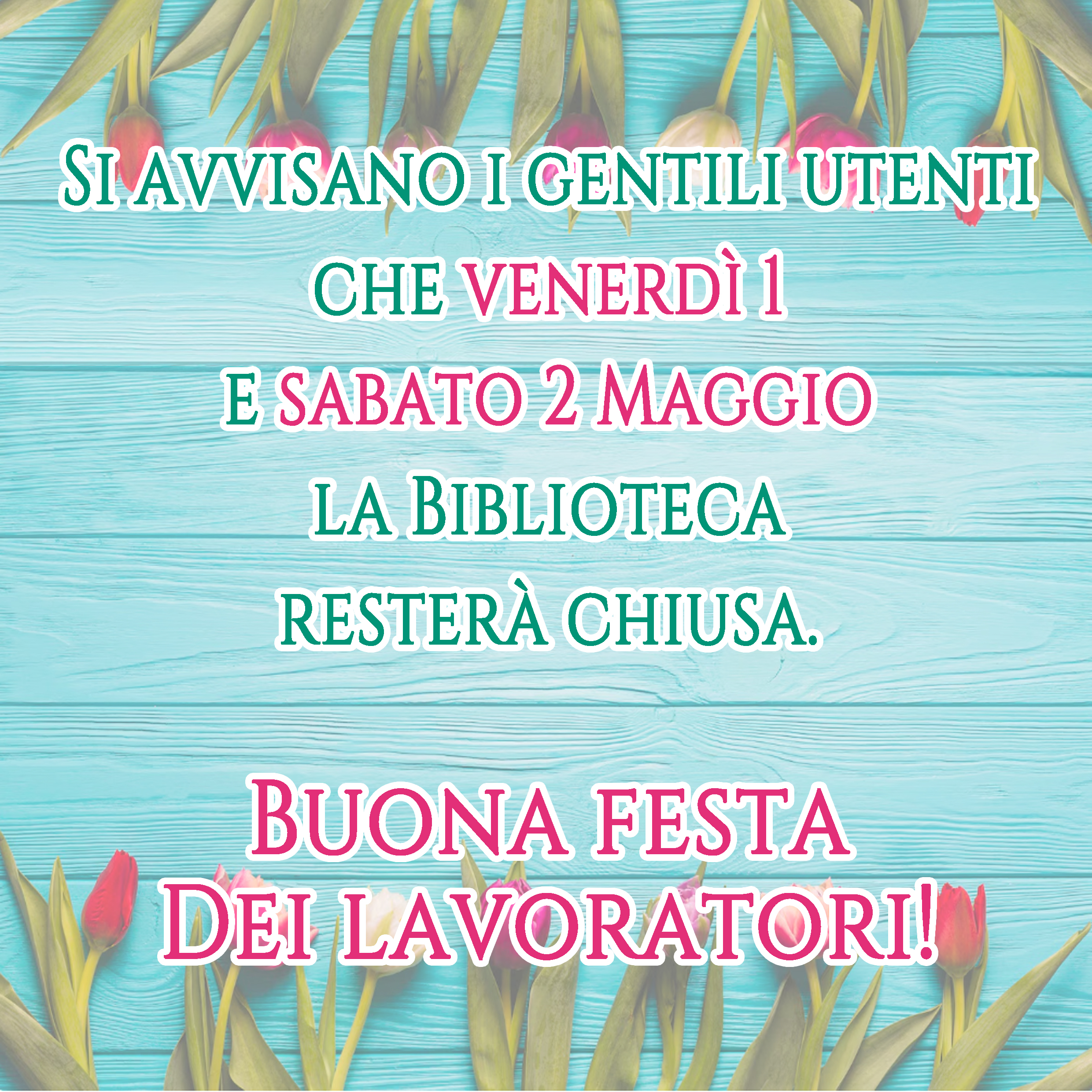 Chiusura aula studio 1 e 2 Maggio inserita il: 23/04/2026 15:57 Si informano i gentili utenti che nei giorni 1 e 2 Maggio la Biblioteca resterà chiusa. Buona festa dei lavoratori!