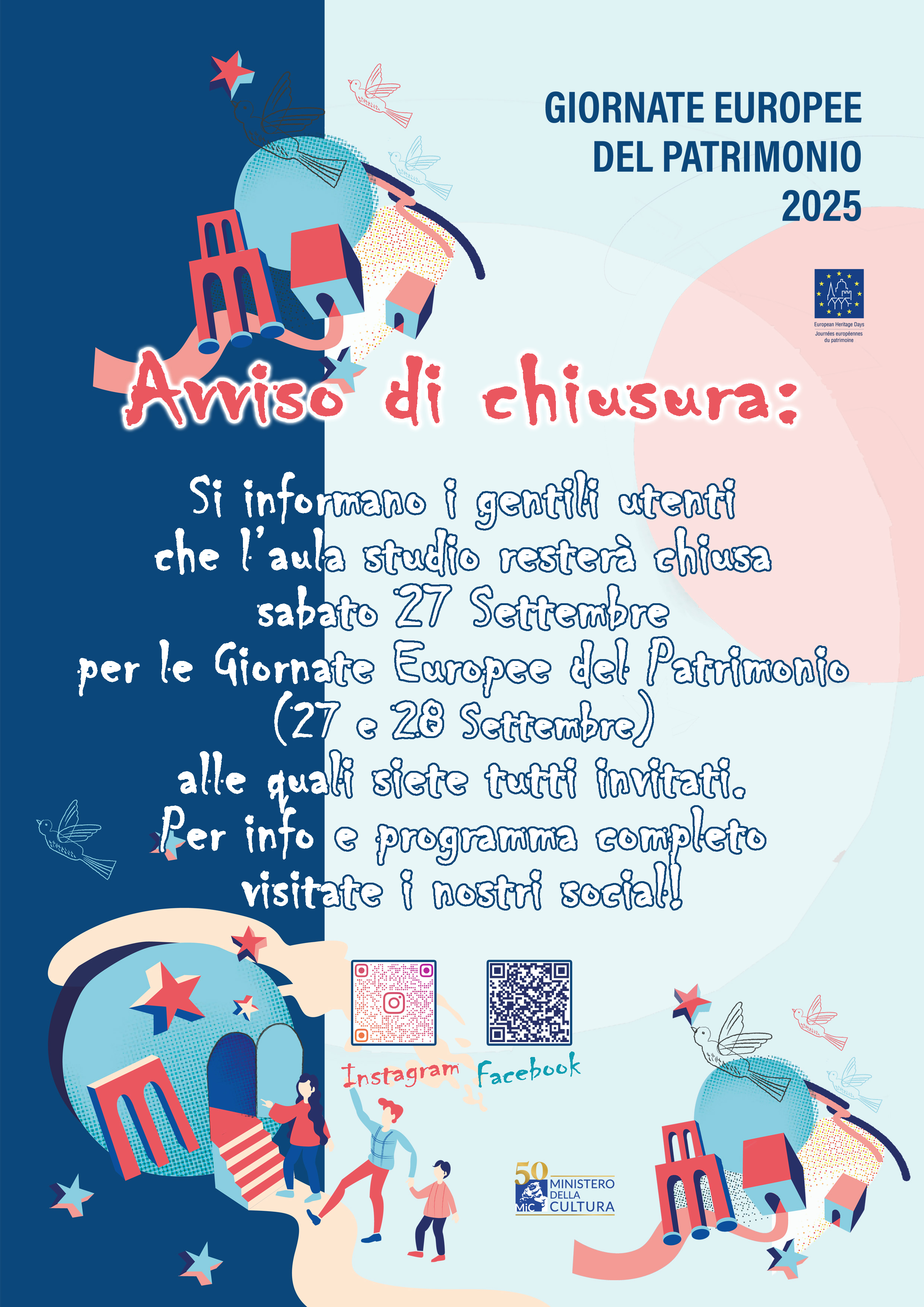 Si informano i gentili utenti che l'aula studio resterà chiusa sabato 27 settembre per le Giornate Europee del Patrimonio (27 e 28 Settembre) alle quali siete tutti invitati.