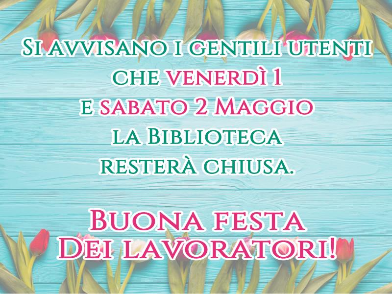 Chiusura aula studio 1 e 2 Maggio inserita il: 23/04/2026 15:57 Si informano i gentili utenti che nei giorni 1 e 2 Maggio la Biblioteca resterà chiusa. Buona festa dei lavoratori!